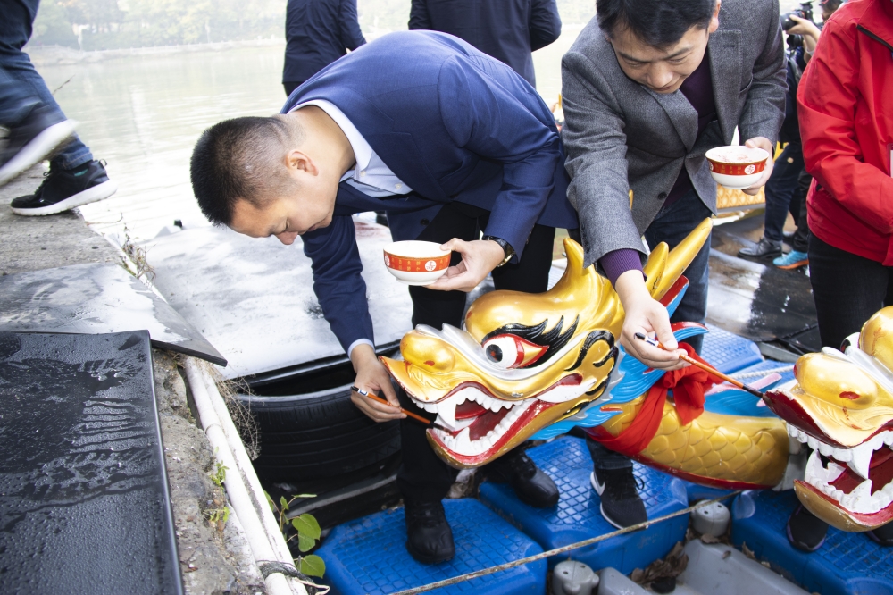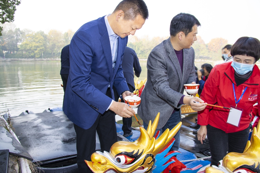 正式比賽之前,吳強市長與張自州等共同為龍舟點睛,祈福國泰民安,傳遞萬家平安的美好愿望。