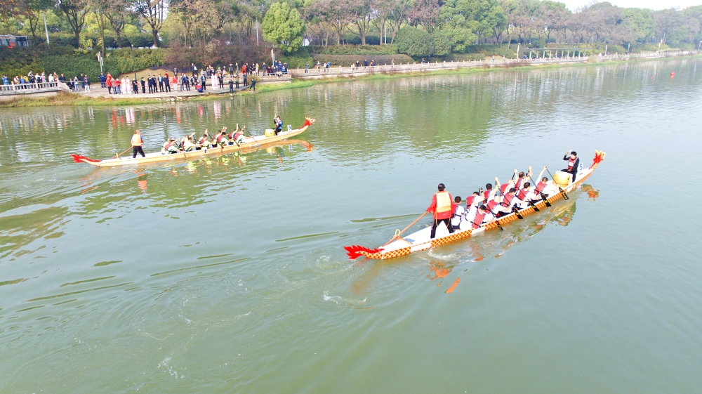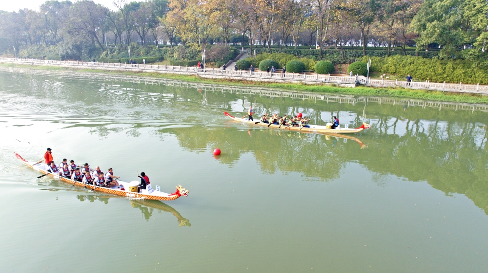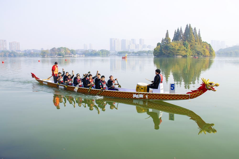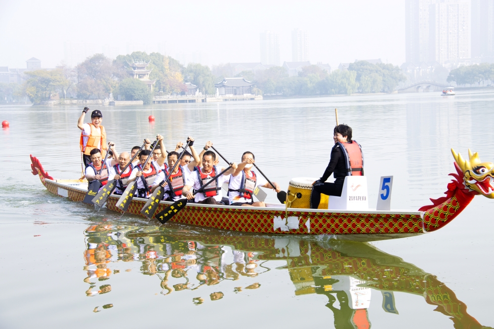 上午九時,一聲哨響,舟如箭發(fā),運動員們揮動船槳,踩著鼓點,喊著號子,直向終點沖去。
