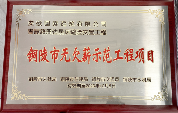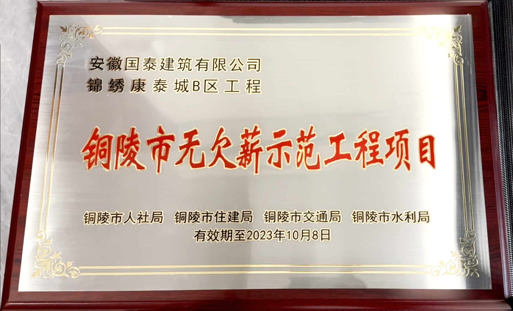 2022年12月14日,由銅陵市人社局、住建局、交通局、水利局聯(lián)合開(kāi)展的建筑行業(yè)“無(wú)欠薪示范工程項(xiàng)目”評(píng)選活動(dòng)揭曉。本次評(píng)選銅陵市共有八項(xiàng)工程項(xiàng)目獲獎(jiǎng),其中國(guó)泰建筑承建的“錦繡康泰城B區(qū)”和“青霞路周邊居民避險(xiǎn)安置工程”兩項(xiàng)工程項(xiàng)目成功獲選為第一批“銅陵市無(wú)欠薪誠(chéng)信示范項(xiàng)目”。