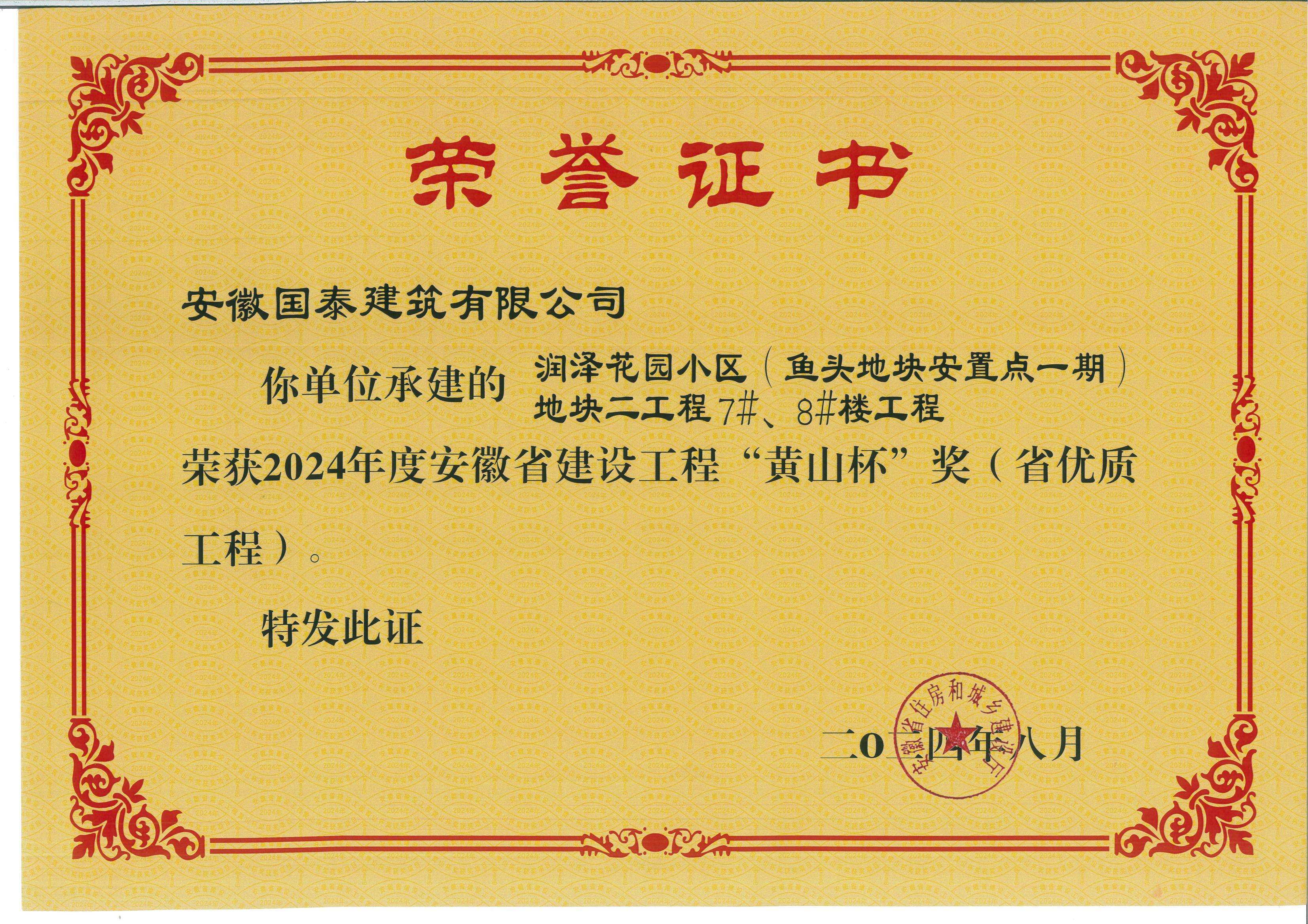 國(guó)泰建筑承建潤(rùn)澤花園地塊工程,喜摘 2024 年度“黃山杯”